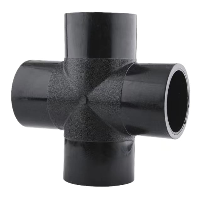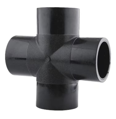HDPE cross butt fusion fittings are produced using injection moulds with identical side dimensions. The raw material, PE100-grade high-density polyethylene (HDPE), is joined to the HDPE pipe using the butt-joint welding method.