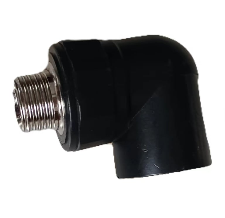 HDPE male elbows with socket fusion welding are produced using injection moulds and stainless steel threads to BSPT standards. The raw material, PE100 grade High Density Polyethylene (HDPE), is joined to the HDPE pipe using the socket fusion welding method.